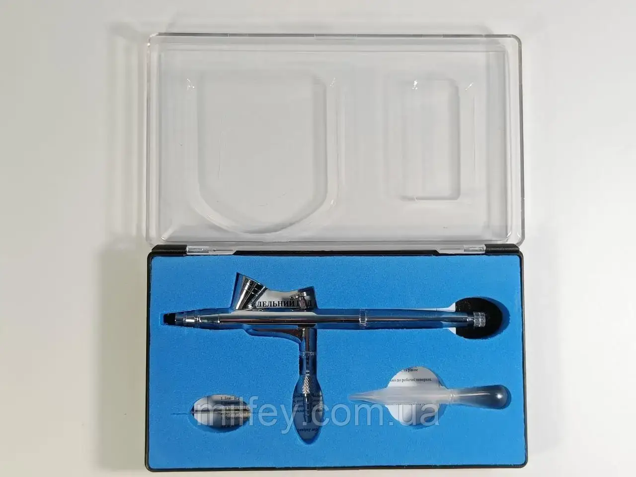 До комплекту до аерографа входить: ключ сопла, сполучна муфта-ялинка, пластикове паковання. Бачок 2 мл, сопло 0,2 мм.